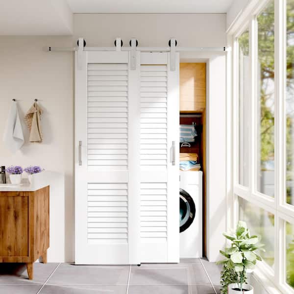 48 in. x 80 in. Louvered Panel White Primed Pine Wood Bypass Barn Door Slab with Nickel-plated Hardware Kit Set