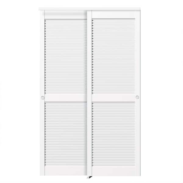 48 in. x 80 in. White Louver MDF Sliding Door Panel with Handle, Hardware Track Kit and Floor Guide, Finished Doors