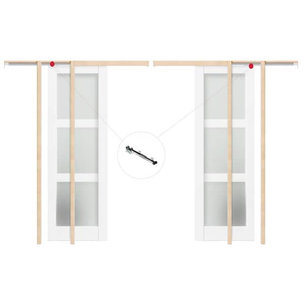 48 in. x 80 in. White Primed Solid Wood 3-Lite Frosted Glass Sliding Pocket Door with Soft Close, Frame and Hardware