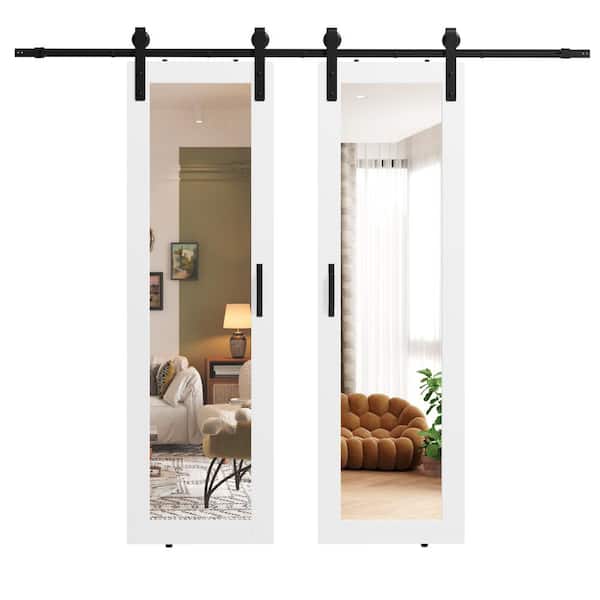 48 in. x 84 in. (Double 24 in. W doors) 1 Lite, Mirrored Glass, White, Finished, MDF Sliding Barn Door with Hardware Kit