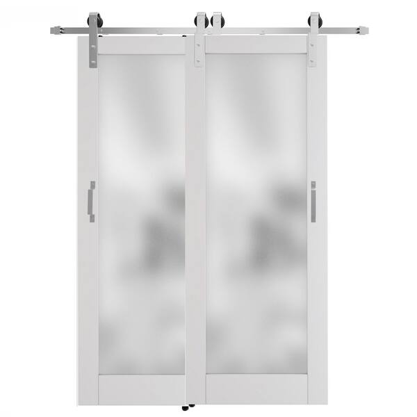 56 in. x 80 in. Full Lite Frosted Glass Solid Wood White Barn Door Slab with Full Bypass Hardware Kit