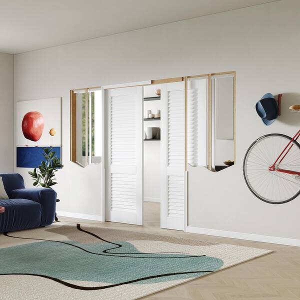 56in. x 80in. White Primed Louvered Panel Pine and MDF Composite Sliding Pocket Door with Soft Close, Frame and Hardware