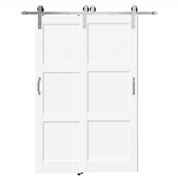 60 in. x 80 in. 3 Panel Core White Primed Pine Wood Bypass Barn Door Slab with Nickel-plated Hardware Kit Set