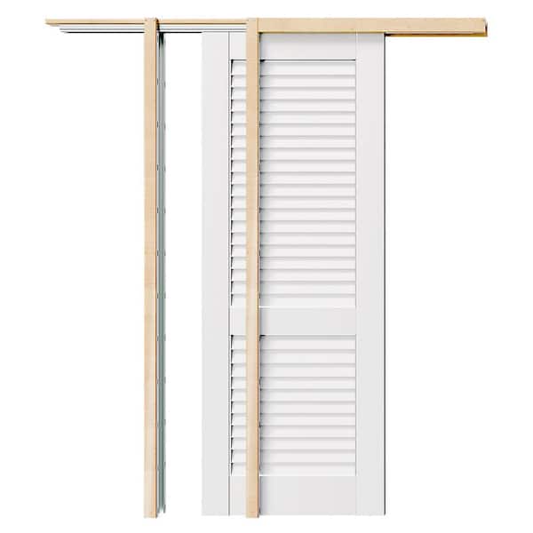 60 in. x 80 in. Pre-Assembled Louvered Panel, MDF, White Primed Pocket Door Frame with Hardware