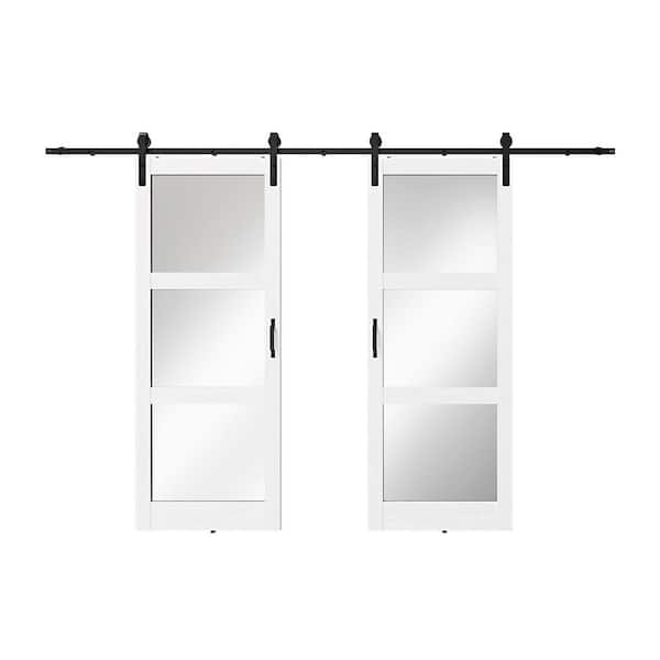 60 in. x 84 in. 3 Lite, 2-Sided Mirrored Glass MDF White Sliding Barn Door with Hardware Kit, Need to Assemble