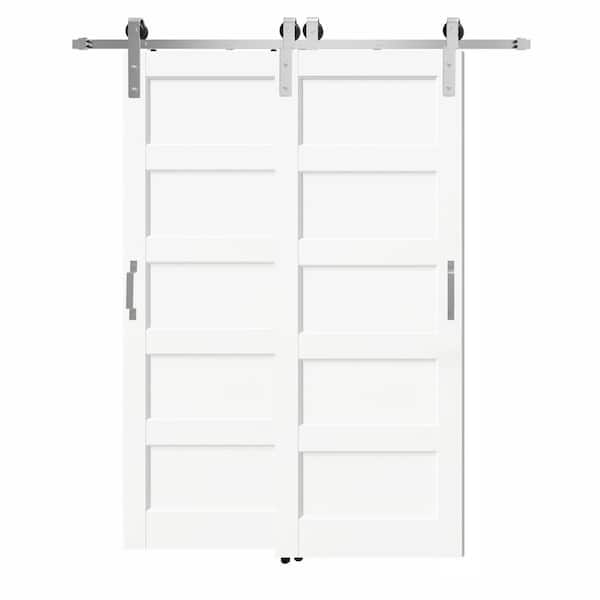 64 in. x 80 in. 5 Panel Core White Primed Pine Wood Bypass Barn Door Slab with Nickel-plated Hardware Kit Set