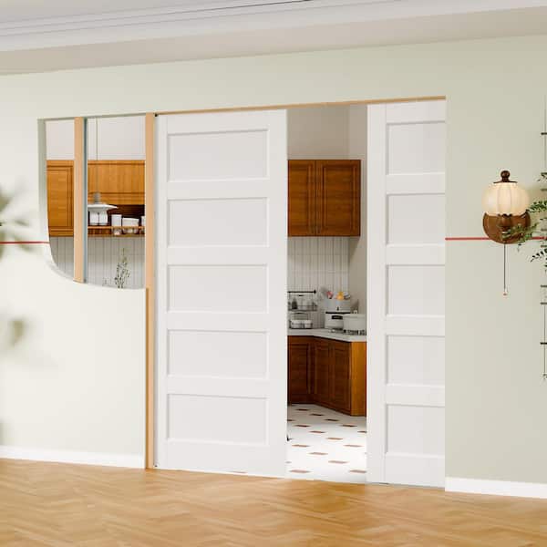 64 in. x 80 in. 5 Panel, Solid Core, DIY Painted, White Primed, MDF, Pre-assembled Sliding Door with All Hardware