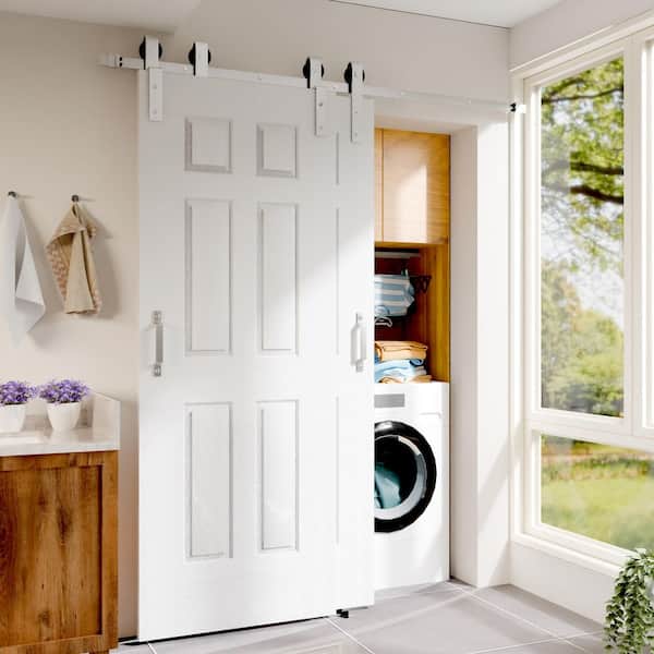 64 in. x 80 in. 6-Panel Hollow Core White Primed MDF, Wood Bypass Barn Door Slab with Nickel-plated Hardware Kit Set