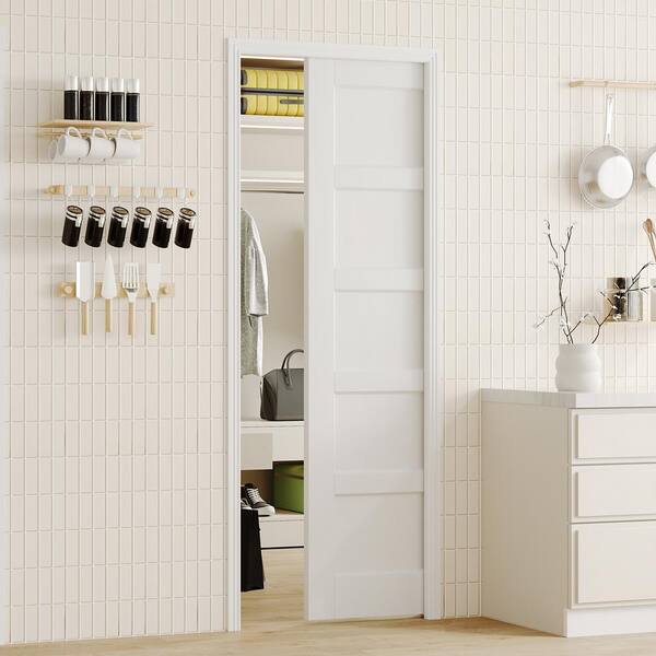 64 in. x 80 in. White Primed 5-Panel Core Pine Wood Sliding Pocket Door with Soft Close, Frame and Hardware Kit Set