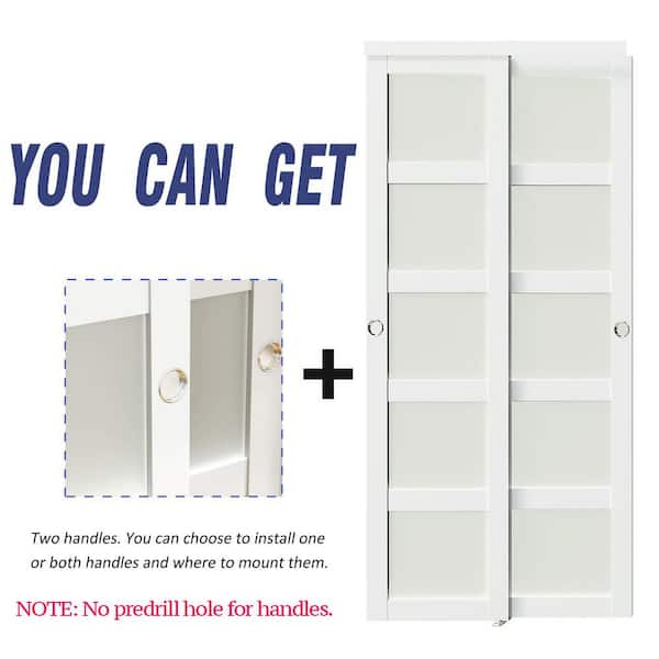 72 in. x 80 in. MDF, Solid Core, White Double Slide, 5-Lites Frosted Glass Sliding Door with Handle & All Hardware