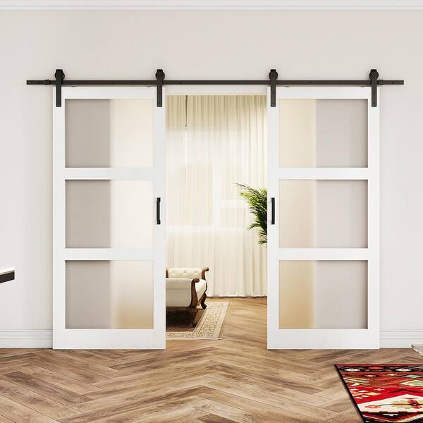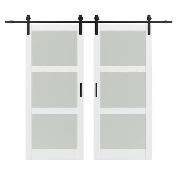 72 in. x 84 in. (Double 36 in. W Doors) 3-Lite Frosted Glass White Solid Hybrid Core MDF Sliding Barn Door Hardware Kit