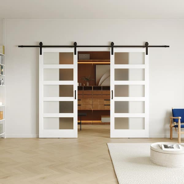 72 in. x 84 in. Frosted Glass, Primed White, MDF, 5-Panel, Painted Sliding Barn Door with Hardware Kit