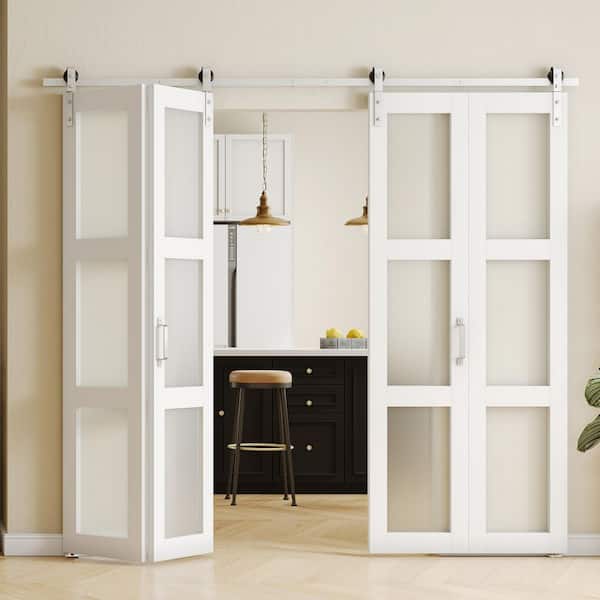 72in x 84in White, 3 Lite, Frosted Glass Finished, MDF Bi-Fold Style Sliding Barn Door with Hardware Kit & Nickel Sliver