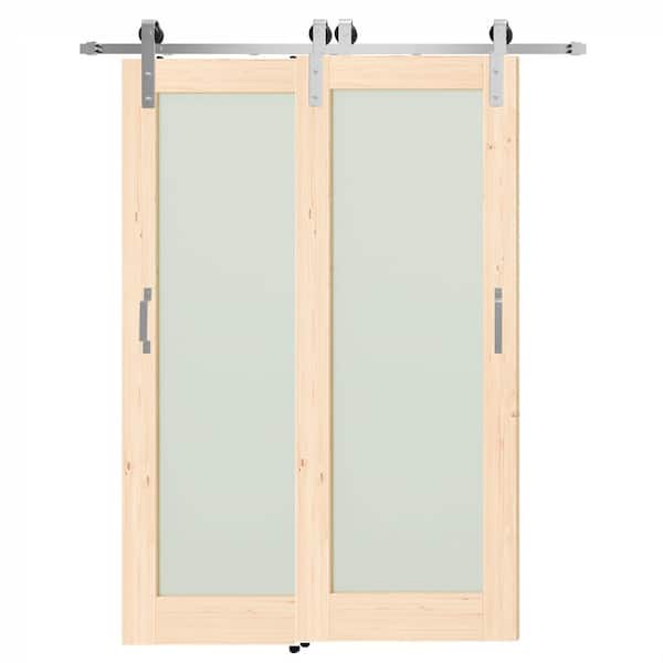 (Double 32) 64 in. x 80 in. Full Lite Frosted Glass Solid Wood Light Brown Barn Door Slab with Bypass Hardware Kit Set