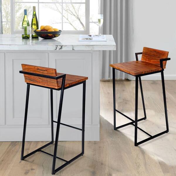35 in. Brown and Black Low Back Metal Frame Industrial Style Barstool with Acacia Wood Seat