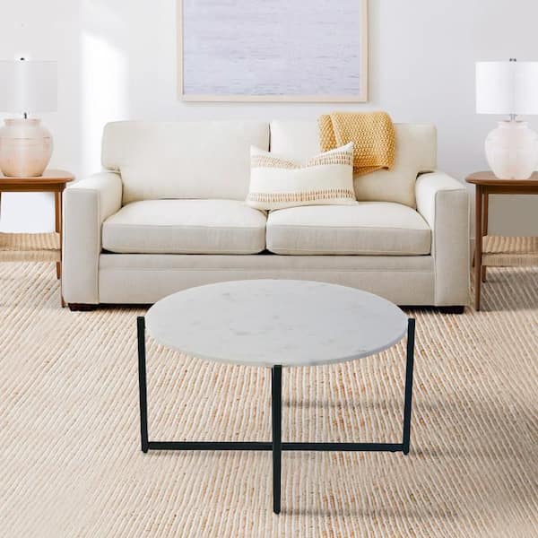 Ivy 30 in. White and Black Round Marble Top Coffee Table with Metal Frame