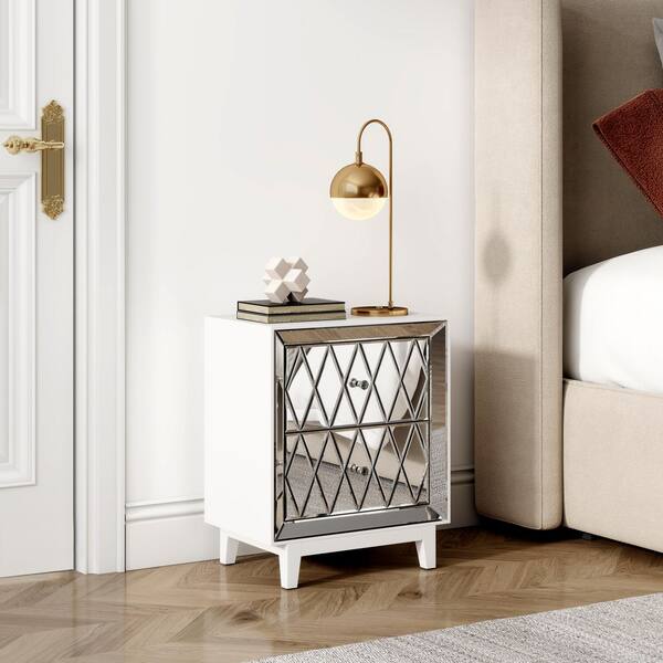 • Mirrored bedside table with two drawers adds sophistication.