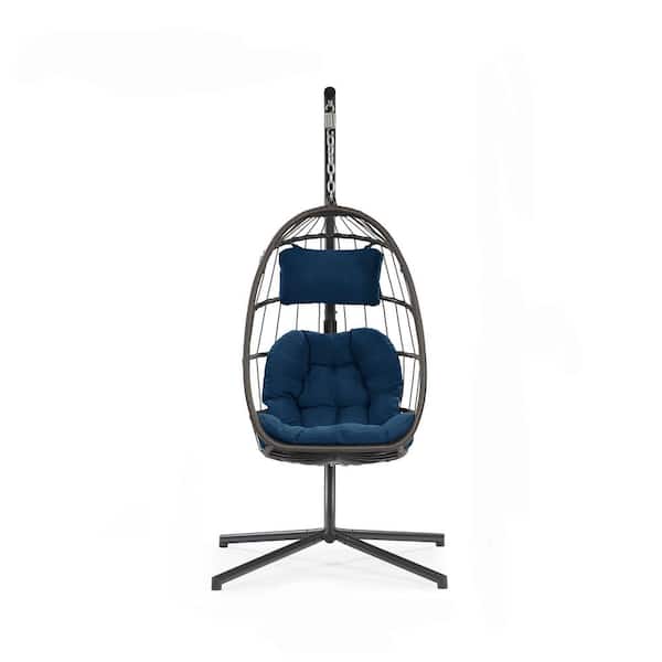 1-Person Wicker Hanging Chair Egg Chair Patio Swing with Blue Cushion
