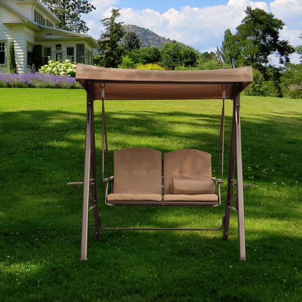 2-Person Steel Frame Patio Swing with Brown Cushions, Pillow and Adjustable Tilt Canopy
