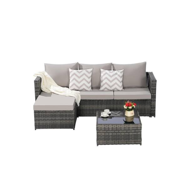 2-Piece Wicker Patio L-Shaped Sectional Set Tempered Glass Table and Light Gray Cushions