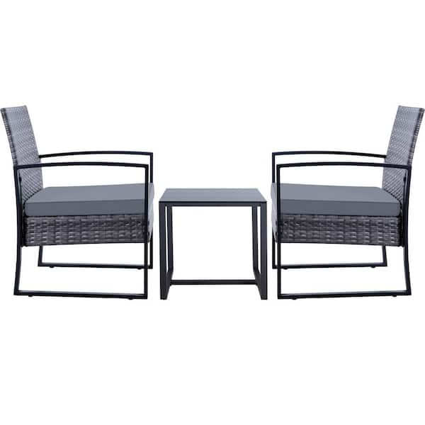 3 Piece PE Wicker Metal Outdoor Conversation Set with Gray Cushions and Table