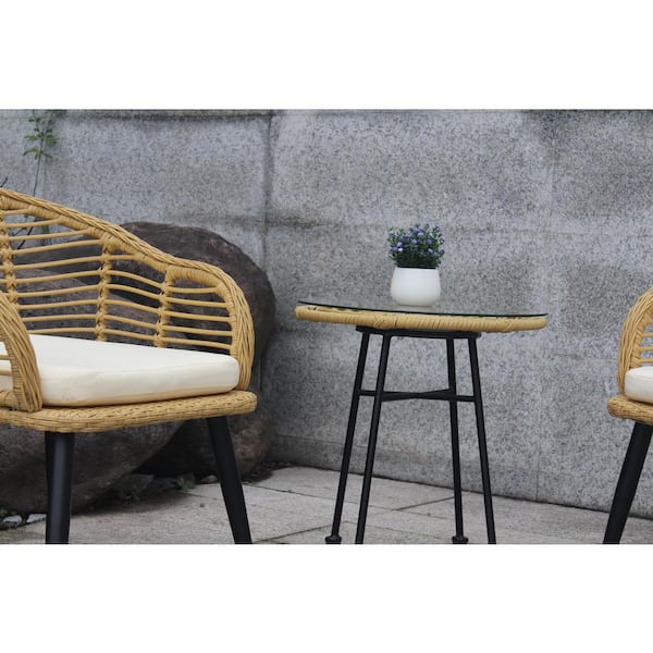 3-Piece Wicker Patio Conversation Set with Beige Cushion and Tempered Glass Table Top