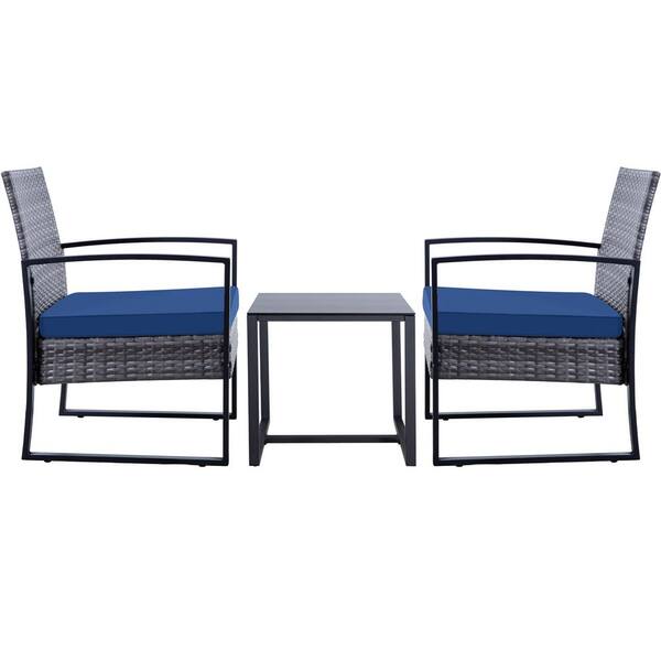 3-Pieces PE Wicker Metal Outdoor Conversation Set with Blue Cushions and Table