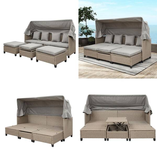 4-Piece Wicker Outdoor Day Bed Sectional Sofa Set with Gray Cushions and Canopy