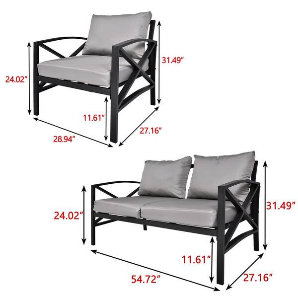 Black Frame 3-Piece Metal Patio Conversation Seating Set with Gray Cushions