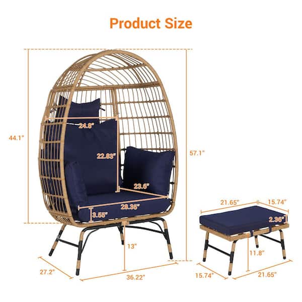 Wicker Oversized Large Egg Chairs with Ottoman and Dark Blue Cushions, Indoor or Outdoor