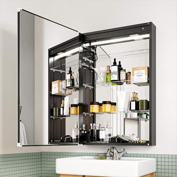 24 in. W x 36 in. H Rectangular Black Aluminum Recessed/Surface Mount Left Dimmable Medicine Cabinet with Mirror