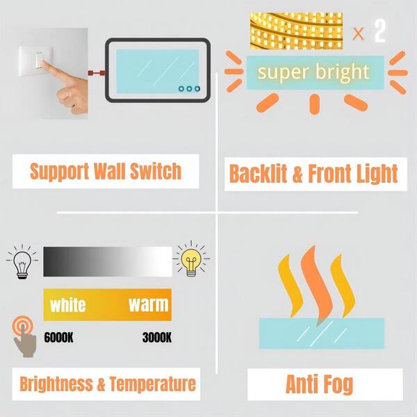 48 in. W x 40 in. H Rectangular Framed LED Anti-Fog Wall Bathroom Vanity Mirror Back and Front Light in Tempered Glass