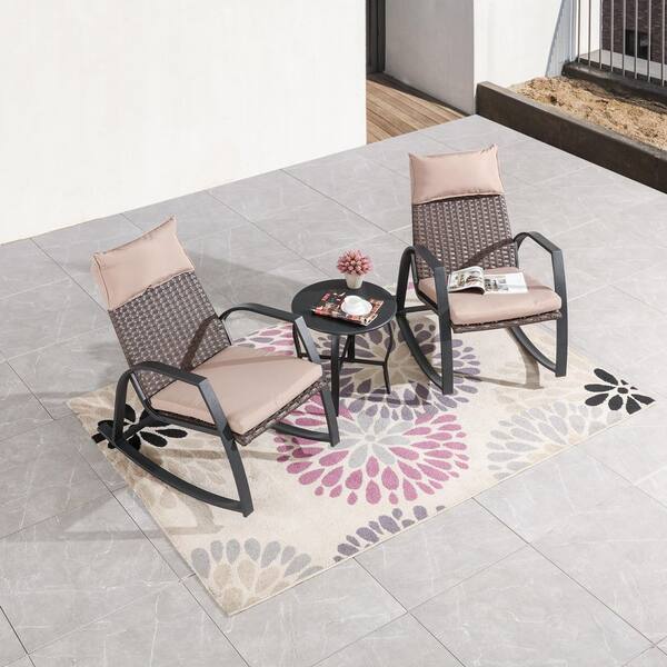 3-Piece Wicker Rocker Outdoor Bistro Set Patio Conversation Set with Khaki Cushions