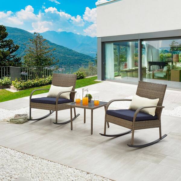 3-Piece Wicker Square Galss Top Coffee Table Rocking Outdoor Bistro Dining Set with Blue Cushion