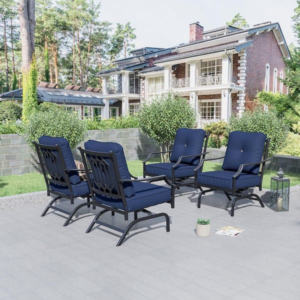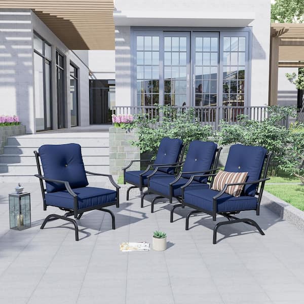 4-Piece Metal Outdoor Rocking Chairs Set with Blue Cushions