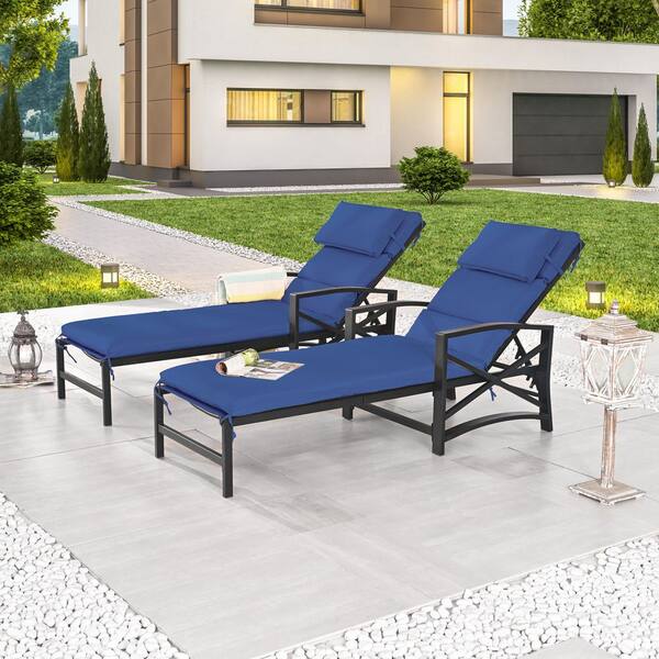 Adjustable Back Metal Outdoor Lounge Chair with Blue Cushions (2-Pack)