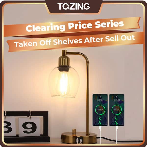 15 in. Industrial Gold Table Lamp with Glass Shade for Bedrooms Bedside Lamps with USB Port and Outlet (Bulb Included)