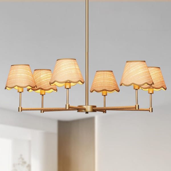 Modern 6-Light Brass Gold Chandelier Transitional Elegant Rattan Pendant Light Fixture for Kitchen Island, Ding Room
