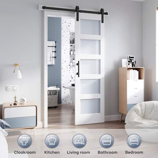 26 in. x 84 in. 5-Lite Tempered Frosted Glass White Finished Solid Core MDF Wood Sliding Barn Door with Hardware Kit