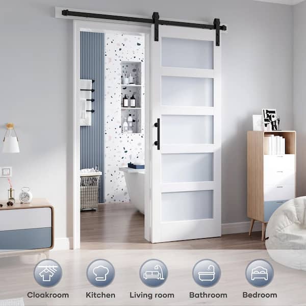 30 in. x 84 in. 5-Lite Tempered Frosted Glass White Finished Solid Core MDF Wood Sliding Barn Door with Hardware Kit