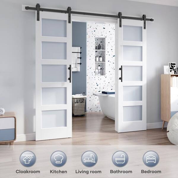 52 in. x 84 in. Double 26 in. Frosted Glass White Finished Solid Core MDF Wood Sliding Barn Door with Hardware Kit