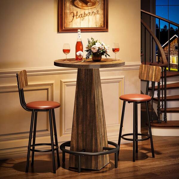 Adan Rustic Brown 37.4 in. Bar Height Round Bar Table Bistro Pub Table with Metal Ring Footrest