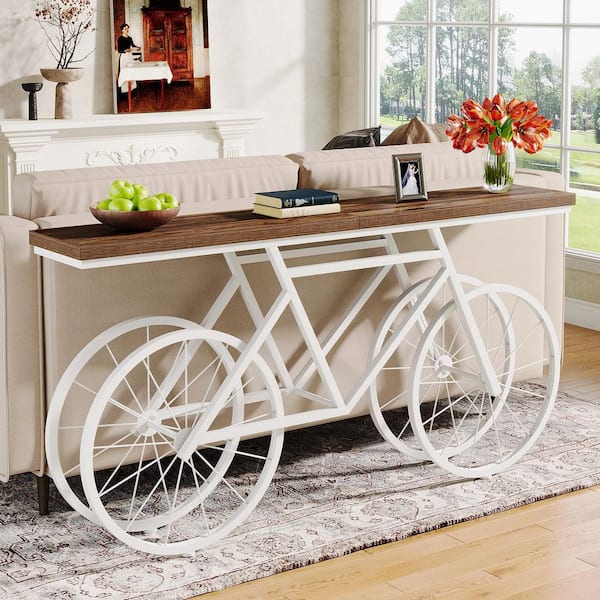 Benjamin 70.9 in. White& Brown Rectangle Wood Extra Long Console Table Bicycle Metal Base Living Room Entryway Hallway