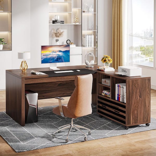 Halseey 62.2 in. x 31 in. Executive L-Shaped Brown Black Wood Drawer Computer Desk Set Mobile File Cabinet Workstation