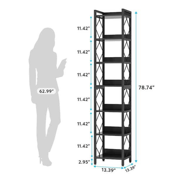 Jannelly 79 in. Black 7-Shelf Wood and Metal Etagere Bookcase Bookshelf, Tall Narrow Corner Shelf Storage Display Rack