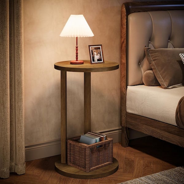 Light Walnut 16 in. Round Farmhouse 2-Tier End Table with Solid Wood Legs, Nightstand Living Room, Bedroom Small Spaces