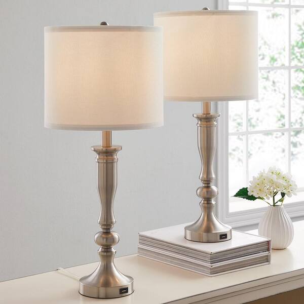 24.5 in. Brushed Nickel USB Table Lamp with 9.5-Watt LED Bulb Included and White Linen Shade