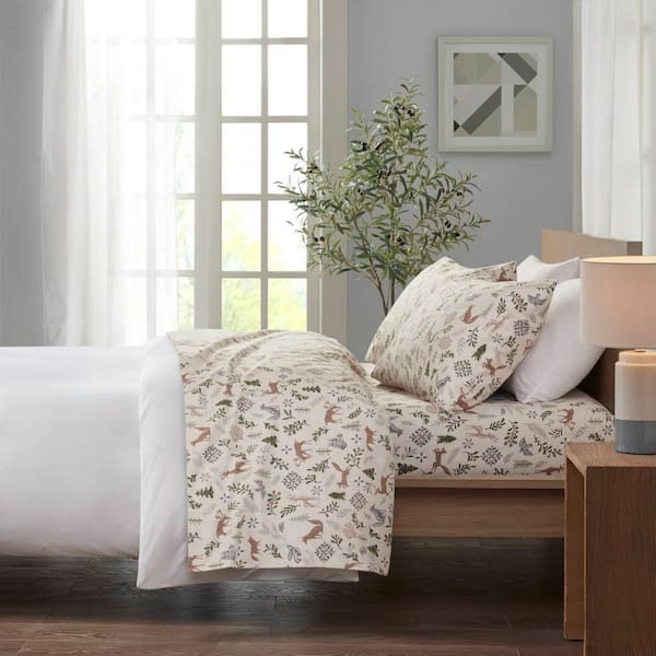 Cozy Cotton Flannel 4-Piece Tan Woodland Winter Cotton King Sheet Set