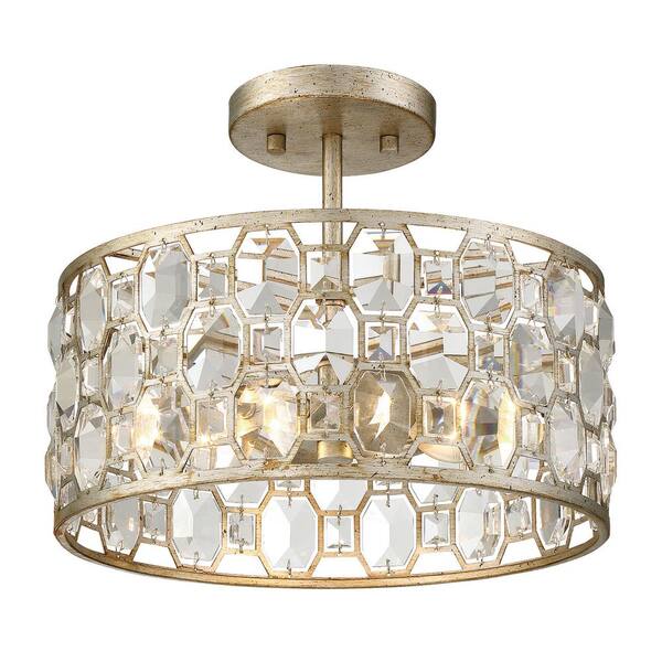 13 in. W x 11 in. H 2-Light Silver Gold Outdoor Semi Flush Ceiling Light with Crystal-Adorned Shade