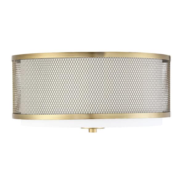 14.75 in. W x 6.25 in. H 3-Light Natural Brass Flush Mount Ceiling Light with White Fabric Shade and Metal Mesh Frame